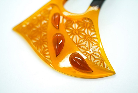 なにわべっ甲は大阪府伝統工芸品に指定されており、繊細な透かし彫り技法に代表される優れた彫刻技術が特徴と言えます。素材をくり抜き、模様の間をレースのように仕上げる技術は熟練ならでは。特にかんざしやアクセサリーにこの技法が用いられています。