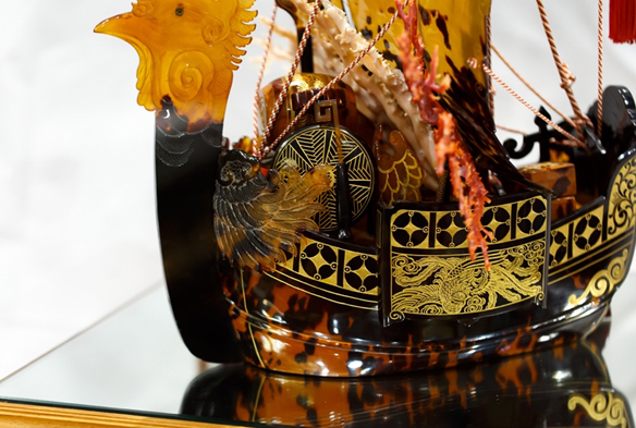 江戸時代、長崎は貿易を行っていた唯一の窓口であり、材料が手に入りやすくべっ甲の発展の中心地となりました。長崎べっ甲の特徴は、緻密で精巧な技法にあり、職人たちの経験と技が息づいています。髪飾りやアクセサリーなどのほかに、日用品も多数製造しています。剥製や宝船なでの大型の置物を製造しているのも魅力の一つです。